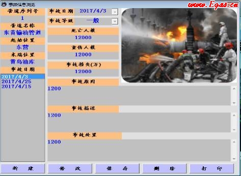 可方便地實現(xiàn)城市油氣管道主要性能參數(shù)的查閱、修改等功能,以管道為項目單位進行管理,主要包括管道基本信息、運行狀態(tài)信息、維修信息、事故信息四部分。維修信息窗口如圖4所示,事故管理窗口如圖 5所示。