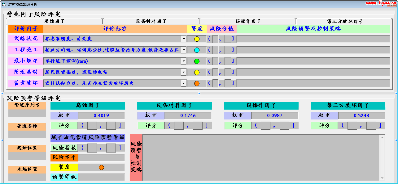 根據(jù)評價因子中所羅列的因素,在對應評價標準下拉菜單中選擇符合實際現(xiàn)場管道情況后,軟件自行判斷其對應的警度、風險分值、風險預警及控制策略,各評價因子的風險評定結(jié)果如圖 8—11所示。 風險評定之后,依據(jù)改進的肯特(W.Kent)管道風險評價方法(piperiskmanagementmanual),參考著名油氣儲運專家潘家華教授提出的風險模型,結(jié)合城市油氣管道風險現(xiàn)狀,給出各風險評定因子的權(quán)重分配,計算每個評定因子的評分錄入預警等級分析界面(如圖 12所示),再計算出最終該管道的評分區(qū)間為(5,7),對照城市油氣管道相對風險指數(shù)警度分級表得出預警等級為高風險巨警,并給出相應的防控策略。
