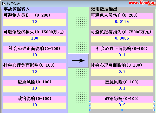 主要包括事故屬性值設(shè)定與屬性重要度排名區(qū)和應急方案總效用值計算區(qū)兩大部分,界面如圖 7所示。