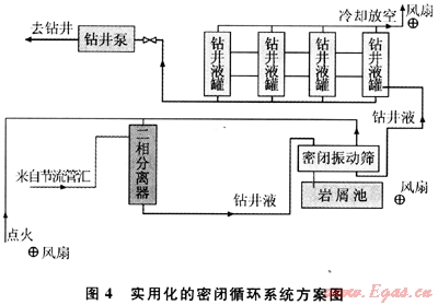 密閉循環(huán)鉆井技術(shù)的關(guān)鍵是采用了密閉循環(huán)系統(tǒng)。密閉循環(huán)系統(tǒng)的主要功能有:①循環(huán)系統(tǒng)全部密閉,防止高含硫氣體泄漏;②進(jìn)行氨洗脫硫處理,將高含硫氣體脫硫后燃燒排放。因此,密閉循環(huán)系統(tǒng)能保證人員安全和達(dá)到環(huán)保要求(圖1)。