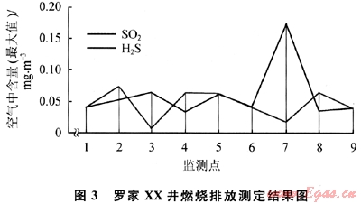 從分離器分離出來(lái)的高含硫氣體,如果直接排放到大氣中會(huì)造成嚴(yán)重的環(huán)境污染,需要進(jìn)行燃燒排放處理。但是現(xiàn)有的資料和現(xiàn)場(chǎng)情況表明,燃燒排放處理難以保證實(shí)現(xiàn)有毒有害氣體的零排放,對(duì)環(huán)境仍會(huì)造成污染。為了搞清楚高含硫天然氣燃燒排放后的大氣環(huán)境情況,分別在羅家X井和羅家XX井利用試井過(guò)程進(jìn)行了燃燒排放實(shí)驗(yàn)。其中,羅家XX井(H2S含量為133.37g/m3)燃燒排放時(shí)環(huán)境空氣中S02和H2S測(cè)定結(jié)果如圖3所示。