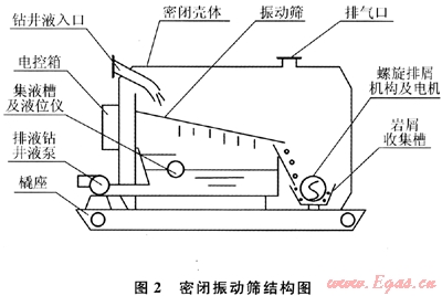根據(jù)上述方案,完成了密閉振動(dòng)篩結(jié)構(gòu)設(shè)計(jì)。采用的技術(shù)方案是:將振動(dòng)篩置入一個(gè)密閉的金屬殼體內(nèi),殼體置于橇座上,不但能防止H2S外泄,同時(shí)也便于吊裝和運(yùn)輸;殼體內(nèi)設(shè)置巖屑收集槽和螺旋排屑機(jī)構(gòu)、集液槽和液位檢測(cè)儀,便于及時(shí)排屑、排液;排屑電機(jī)和排液鉆井液泵、電控箱安裝在殼體外,避免在高濃度H2S氣體環(huán)境下發(fā)生燃爆;殼體上部設(shè)置通氣法蘭,便于連接抽氣設(shè)備排出殼體內(nèi)高濃度的H2S氣體。