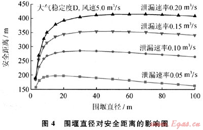 LNG儲罐周圍通常要設(shè)計圍堰,以防止儲罐發(fā)生泄漏時,液體四處流淌蔓延,若發(fā)生火災(zāi),還可以防止火焰蔓延到周邊地區(qū)[4]。LNG泄漏到圍堰內(nèi),會迅速蒸發(fā)氣化,形成以圍堰為二次源的蒸氣云團(tuán)擴(kuò)散。圖4給出下風(fēng)向安全距離隨著圍堰直徑和泄漏速率的變化。當(dāng)圍堰尺寸較小時,以圍堰為二次源云團(tuán)的范圍也較小,有限的蒸發(fā)氣受大氣湍流影響,其濃度較快稀釋,安全距離較??;當(dāng)圍堰尺寸過于增大時,二次源云團(tuán)的天然氣濃度較低,其下風(fēng)向擴(kuò)散距離不再增加,反而略有減少。