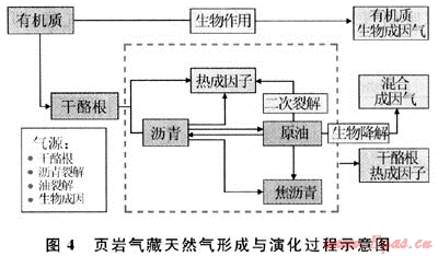 研究表明,熱成因氣的形成有干酪根成氣、原油裂解成氣和瀝青裂解成氣3種途徑:①干酪根成氣是由沉積有機質直接熱解形成天然氣。②原油裂解成氣是有機質在液態(tài)烴演化階段形成的、滯留在烴源巖中的液態(tài)烴,經(jīng)深埋藏后的高溫、高壓作用,進一步裂解成氣。③瀝青裂解成氣的物質基礎來源于兩個方面:一是源巖中干酪根在各演化階段生烴過程中形成的,另一方面是由原油裂解成氣或遭破壞形成的。原油及瀝青二次裂解生成的天然氣量大小主要取決于烴源巖中有機質豐度、類型以及液態(tài)烴殘留量。由烴源巖有機質熱演化直接成氣及原油裂解成氣是頁巖氣藏中天然氣的主要來源。