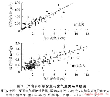 2) 有機碳含量愈高,氣藏富集程度愈高。商業(yè)性頁巖氣藏需要達到頁巖有機碳含量最低界限標準。斯倫貝謝公司對北美頁巖氣盆地的研究認為,頁巖氣藏的有機碳含量最低標準原則上應大于2.0%(表4)。因此,有機碳含量是頁巖氣藏評價中的一個重要指標,它既是頁巖生氣的物質基礎,決定頁巖的生烴強度,也是頁巖吸附氣的載體之一,決定頁巖的吸附氣大小,還是頁巖孔隙空間增加的重要因素之一,決定頁巖新增游離氣的能力。在相同的地質條件及演化階段下,頁巖生烴強度、吸附氣量大小及新增游離氣能力與頁巖中有機碳含量呈明顯的線性正相關性。實驗分析結果表明,頁巖含氣量(吸附氣及游離氣總量)隨頁巖有機碳含量的增加而增大(圖7-a)。對加拿大哥倫比亞省下白堊統(tǒng)BuckingHorse組202塊頁巖樣品的等溫吸附實驗結果也同樣表明[7],頁巖有機碳含量與甲烷吸附量之間呈正相關分布(圖7-b)。此外,不同母質類型、不同演化程度的頁巖,其等溫吸附曲線也存在明顯差別。頁巖有機質類型越好,甲烷的吸附量越大[7]。但與此同時,圖6、圖7中也存在一些異?,F(xiàn)象,說明頁巖含氣量大小不僅僅受有機碳含量的影響,還可能受其他多種因素的影響,如黏土成分及含量、有機質熱成熟度、頁巖含水量等。對此,尚需作進一步的深入研究。