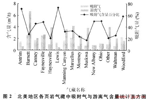 圖2為美國頁巖氣藏中的氣體組成統(tǒng)計結果,表明不同地質條件下形成的頁巖氣藏其吸附氣與游離氣的含量存在較大差別。頁巖氣藏中吸附氣含量比例較高,變化范圍較大。頁巖含氣量最高的(如Barnett頁巖氣藏)可達10m3/t,最低(如New Albany頁巖氣藏)僅有1.1m3/t,含氣量平均為3.81m3/t。其中,吸附氣含量最低為16%,最高達80%。吸附氣含量的變化主要受巖石組成、有機質含量、地層壓力、裂縫發(fā)育程度等因素影響,詳見后述。