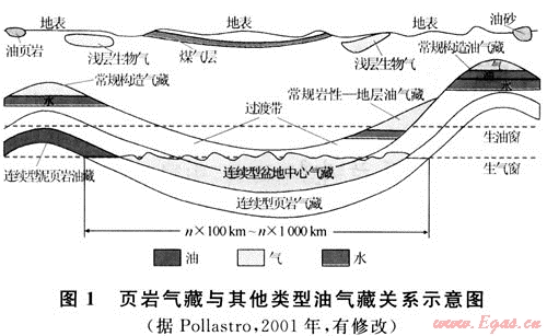 2) 無明顯圈閉:傳統(tǒng)上的常規(guī)油氣均聚集在圈閉中,圈閉是油氣藏形成的基礎,決定著油氣藏的基本特征以及勘探方法。頁巖氣藏雖在字面上還稱之為藏,實則沒有藏的邊界,即頁巖氣不是聚集在某個圈閉中成藏的,而是包含盆地中已經(jīng)進入生氣窗范圍內(nèi)的所有烴源巖中皆可成藏(圖1)。常規(guī)油氣藏,即使是巖性油氣藏,都是在一定的構造背景下形成的,而頁巖氣藏不受構造因素的控制。