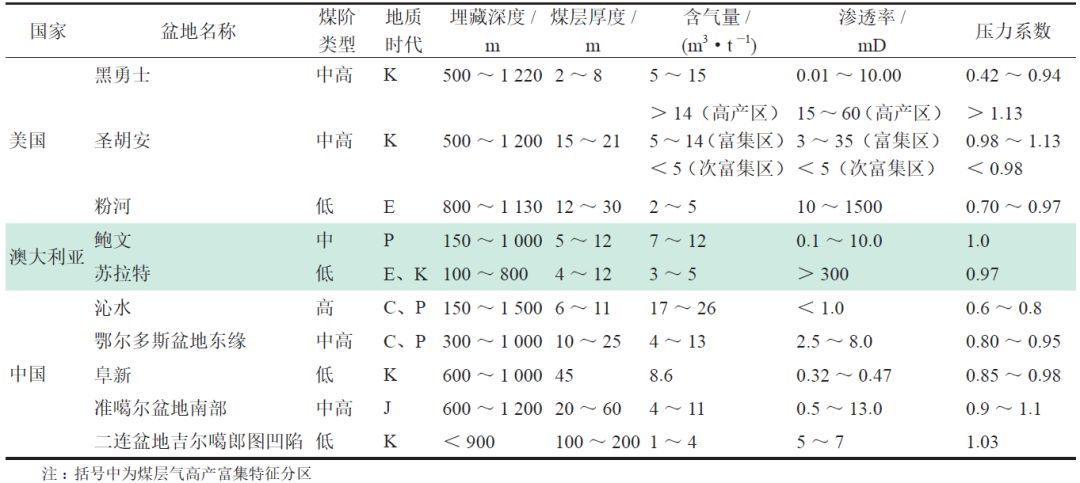 表1 中外煤層氣主力產(chǎn)區(qū)儲(chǔ)層參數(shù)對(duì)比表