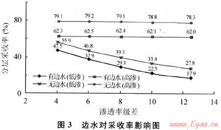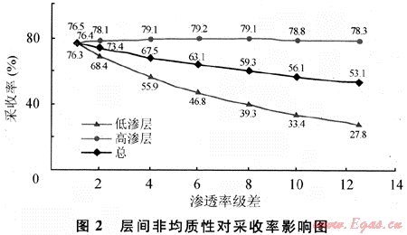 采用數(shù)值模擬描述分層的儲(chǔ)量動(dòng)用情況與前兩者一致,隨著滲透率級(jí)差的增大,高滲層(恒為25×10-3μm2)儲(chǔ)量動(dòng)用變化不大,而低滲層的儲(chǔ)量動(dòng)用越來(lái)越差,當(dāng)級(jí)差為6時(shí),采收率為63%,低滲層只采出47%(圖2)。