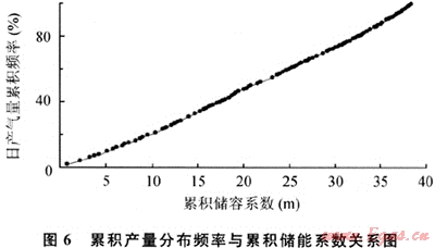 由圖6可以看出:日產(chǎn)氣量與累計(jì)儲(chǔ)容系數(shù)相關(guān)性很好。表明分層產(chǎn)量除受地層系數(shù)影響外,還與儲(chǔ)容系數(shù)有關(guān),即高滲層的儲(chǔ)量決定了氣井的產(chǎn)量水平和穩(wěn)產(chǎn)能力。綜合分析認(rèn)為,四-1單元高滲層中儲(chǔ)量所占比例較少,不能滿(mǎn)足目前氣井配產(chǎn)的穩(wěn)產(chǎn)需求,由此表現(xiàn)出氣井產(chǎn)量遞減。