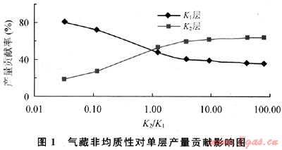物理模擬實(shí)驗(yàn)研究結(jié)果也證實(shí)了這一結(jié)論:兩層合采時(shí),K1層產(chǎn)量貢獻(xiàn)率隨K2/K1比值增加而降低,當(dāng)兩層滲透率相同時(shí)各產(chǎn)層產(chǎn)量貢獻(xiàn)率幾乎相同,即兩層都能被充分動(dòng)用(圖1)。