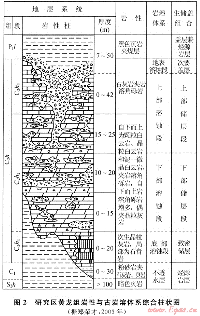 位于四川盆地東部的渝北-鄰水地區(qū)在范圍上包括重慶市的渝北區(qū)、北碚區(qū)和四川省的鄰水縣與華鎣山市,面積約3900km2(圖1)。上石炭統(tǒng)黃龍組為該地區(qū)天然氣主要產層,儲層屬于古巖溶成因類型[5~7],區(qū)內發(fā)育有鄰北、板東、板橋、座洞崖、銅鑼峽、相國寺和環(huán)山等眾多次一級構造控制的黃龍組氣藏,具備很大的勘探開發(fā)潛力。研究區(qū)石炭系受海西早期強烈構造隆封和侵蝕作用,只殘存了不完整的上石炭統(tǒng)黃龍組拱不整合超覆在中志留統(tǒng)韓家店組暗色泥頁巖之上,頂面被下二疊統(tǒng)梁山組煤系地層超覆,自下而上被劃分為3個巖性和巖相截然不同的巖性段[8](圖2)。