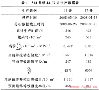 J2和J7是S14井組不同時(shí)間投產(chǎn)的生產(chǎn)井,基本數(shù)據(jù)如表1所示。首先根據(jù)氣井的生產(chǎn)時(shí)間及當(dāng)前單位套壓降產(chǎn)氣量查對(duì)Gp/△pc2-t圖版(圖2),可初步判斷蘇J2為Ⅲ類(lèi)井,J7為Ⅱ類(lèi)井;然后采用FAST.RTA軟件對(duì)氣井進(jìn)行動(dòng)態(tài)分析,可得到氣井的當(dāng)前井控動(dòng)態(tài)儲(chǔ)量Gt和等效泄流半徑(Rt);再根據(jù)井型和生產(chǎn)時(shí)間查對(duì)Gt/G-t圖版(圖3-b),得到2口井的Gt/G值分別為48%和60%,由此可求出最終井控動(dòng)態(tài)儲(chǔ)量(G)和最終等效泄流半徑(R)。