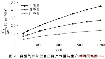 S6區(qū)塊是蘇里格氣田最早投產(chǎn)的區(qū)塊,其地質(zhì)條件與蘇里格氣田其他區(qū)塊相似,氣井的生產(chǎn)動(dòng)態(tài)也基本相似。S6區(qū)塊第一批生產(chǎn)井于2002年投產(chǎn),生產(chǎn)期已超過(guò)7a,氣井的滲流邊界已達(dá)到或接近真實(shí)的氣藏邊界,處于低壓低產(chǎn)中后期。在實(shí)際生產(chǎn)中,絕大部分氣井只進(jìn)行了井口油套壓和產(chǎn)量的監(jiān)測(cè),對(duì)氣井的生產(chǎn)數(shù)據(jù)進(jìn)行分析,發(fā)現(xiàn)氣井的單位套壓降采氣量(Gp/△pc2)隨生產(chǎn)時(shí)間動(dòng)態(tài)變化,兩者之間呈良好的二次多項(xiàng)式關(guān)系,相關(guān)系數(shù)大于0.96。即
