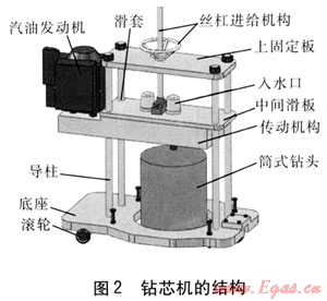 鉆芯機(jī)的結(jié)構(gòu)見圖2,主要由動(dòng)力源、傳動(dòng)機(jī)構(gòu)、進(jìn)給機(jī)構(gòu)、導(dǎo)向機(jī)構(gòu)、鉆頭、底座等組成。