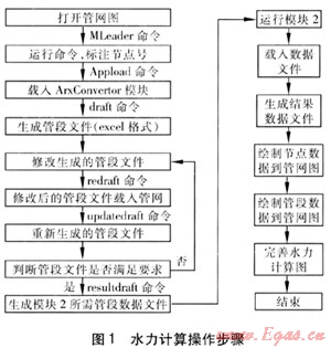 利用GPA軟件進(jìn)行水力計(jì)算,操作人員僅需熟悉AutoCAD與Excel的操作命令即可,簡便易懂。利用GPA軟件進(jìn)行水力計(jì)算的詳細(xì)操作步驟見圖1。