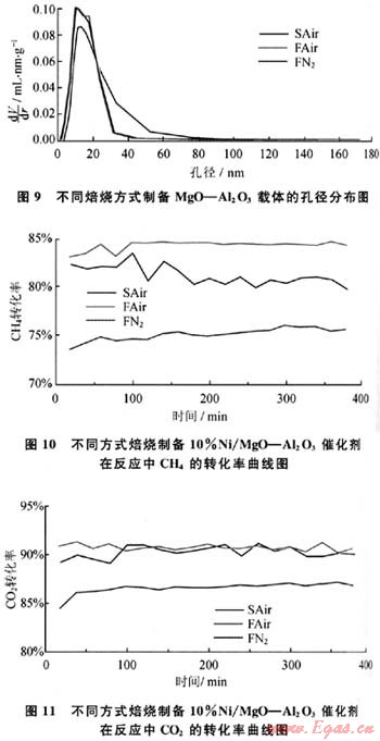 10、圖11為不同方式焙燒MgO-Al203載體制備10%Ni/ MgO-Al203催化劑在反應(yīng)中CH4和CO2的轉(zhuǎn)化率。從圖10、11中可以看出,流動(dòng)空氣條件下焙燒載體催化劑的催化活性較好,CH4和CO2的轉(zhuǎn)化率分別可以達(dá)到82%和92%左右,隨著反應(yīng)的進(jìn)行,流動(dòng)空氣焙燒催化劑的催化活性一直較為穩(wěn)定,表明催化劑的穩(wěn)定性較好。
