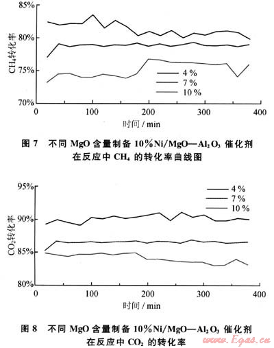 7、圖8為不同含量MgO-Al203載體制成10%Ni/MgO-Al203催化劑在反應(yīng)中CH4和CO2的轉(zhuǎn)化率。從圖7、8中可以看出,在反應(yīng)過(guò)程中10%Ni/4%MgO-Al203催化劑的催化活性最高,CH4和CO2轉(zhuǎn)化率分別為82%和90%左右。隨著反應(yīng)的進(jìn)行,10%Ni/4%MgO-Al203催化劑的催化活性略有浮動(dòng),但其轉(zhuǎn)化率仍然較高,在整個(gè)反應(yīng)過(guò)程中催化劑的催化活性變化都不是很大,表明其穩(wěn)定性較好。