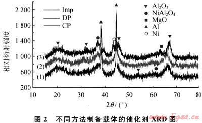 2為不同方法制備4%MgO-Al203載體制成催化劑的XRD譜圖。通過(guò)與標(biāo)準(zhǔn)譜圖進(jìn)行對(duì)比可以得知這3種催化劑中都存在Ni、Al、MgO、Al203、NiAl2O4相,其中,當(dāng)2θ為36°處存在NiAl2O4尖晶石的衍射峰,共沉淀法制備的載體催化劑的NiAl2O4衍射峰最弱,而其他兩種方法NiAl2O4的衍射峰逐漸增強(qiáng),說(shuō)明Ni與Al2O3的相互作用較強(qiáng),使活性中心Ni的含量較少,進(jìn)而影響其催化劑的催化活性。