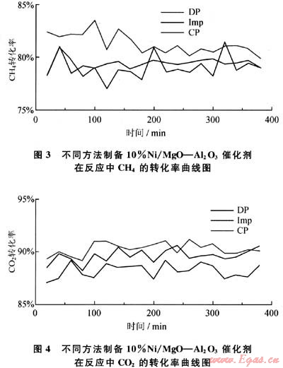 用不同方法制備4%MgO-Al203載體,用浸漬法負(fù)載Ni,制備成10%Ni/4%MgO-Al203催化劑,在常壓固定床反應(yīng)器中測(cè)得CHn的轉(zhuǎn)化率(XCH4)和C02的轉(zhuǎn)化率(XCO2)(圖3、4)。從圖3、4中可以看出,在反應(yīng)開(kāi)始階段共沉淀法制備的載體催化劑的初始活性較高,可以超過(guò)90%,高于沉積沉淀法和浸漬法的催化活性,隨著反應(yīng)時(shí)間的進(jìn)行,CH4和C02的轉(zhuǎn)化率始終保持較高,但反應(yīng)進(jìn)行4h后,催化劑發(fā)生了積炭,催化活性有所降低,說(shuō)明其穩(wěn)定性不是很好。