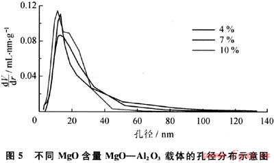 5為共沉淀法制備MgO-Al203的孔徑分布曲線。從圖5中可以看出,3種不同MgO含量載體的孔徑分布較為集中,主要在12nm,7%MgO-Al203、10%MgO-Al203的孔徑和孔體積差不多,4%MgO-Al203載體的孔徑和孔體積較小。
