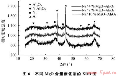 6為不同MgO含量的載體催化劑的XRD譜圖,通過(guò)與標(biāo)準(zhǔn)譜圖對(duì)比可以看出,在2口為36°和62°兩處出現(xiàn)NiAl2O4尖晶石的衍射峰,4%MgO-Al203載體曲線中NiAl2O4的衍射峰很弱,但隨著MgO加入量的增加,NiAl2O4的衍射峰逐漸增強(qiáng),說(shuō)明Ni與Al2O3的相互作用增強(qiáng),活性中心Ni逐漸減少,而且4%MgO-Al203載體的曲線比較散漫,表明粒徑分布較為均勻,使得催化活性較好。