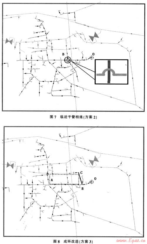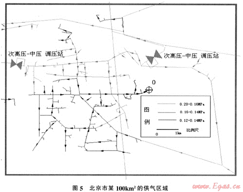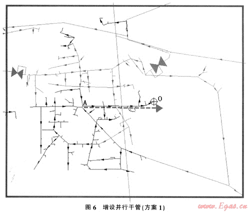 如圖5所示為北京市某區(qū)域天然氣管網(wǎng)圖,其供氣區(qū)域約為100km2。此區(qū)域內(nèi)中壓管網(wǎng)氣源,為兩座高中調(diào)壓站,供應(yīng)壓力為0.2MPa,高時(shí)總負(fù)荷70000(m3/h),負(fù)荷點(diǎn)422個(gè).根據(jù)管網(wǎng)模擬軟件計(jì)算可知末端壓力為0.131MPa。處于該區(qū)域的東部(如上圖黑管線)。根據(jù)規(guī)劃此區(qū)域內(nèi)負(fù)荷將有明顯的增加.因此.必須提早做出切實(shí)可行的管網(wǎng)改造方法。