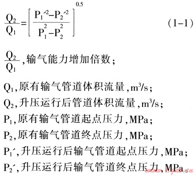 ,假設(shè)升壓前后其它參數(shù)均不變,則輸氣能力的倍數(shù)關(guān)系為: