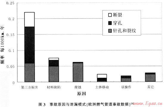 實(shí)踐證明,管網(wǎng)長(zhǎng)期低壓運(yùn)行,一旦升高管網(wǎng)運(yùn)行壓力將增大由于材料缺陷和腐蝕引起天然氣泄漏的機(jī)率。但是從歐洲燃?xì)夤艿赖慕y(tǒng)計(jì)數(shù)據(jù)來(lái)看(圖3)。管道自身原因?qū)е碌男孤┩容^輕微(針孔和裂紋)。發(fā)生重大事故的可能性較小。因此,升壓運(yùn)行帶來(lái)的風(fēng)險(xiǎn)并不大,并且完全可以通過(guò)采取必要的保護(hù)措施加以規(guī)避。