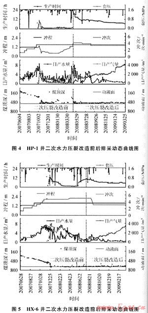 HP-1井和HX-6井為例(如圖4、5所示)。HP-1井二次壓裂改造前套壓僅0.05MPa左右,產(chǎn)氣385m3/d,產(chǎn)水2.1m3/d,通過采取活性水二次壓裂(壓裂液液量134.4m3,排量3.5m3/min,加砂量2.4%)改造后,套壓上升到0.42MPa,產(chǎn)氣4062m3/d,產(chǎn)水0.8m3/d,單井日產(chǎn)氣提高了10倍。HX1-6井二次壓裂改造前套壓為0.04MPa左右,產(chǎn)氣775m3/d,產(chǎn)水5.3m3/d,通過采取活性水二次壓裂(壓裂液液量104.0m3,排量4.0m3/min,加砂量3.8%)改造后,套壓上升到0.30MPa,產(chǎn)氣2120m3/d,產(chǎn)水0.9m3/d,單井日產(chǎn)氣也提高了3倍[10~11]。