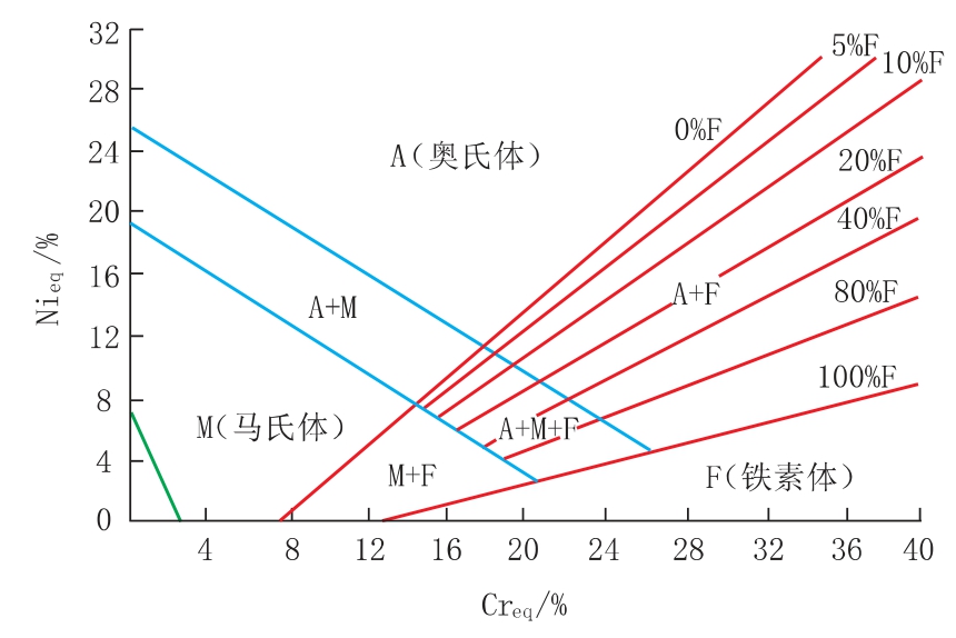 舍夫勒圖估算法的具體步驟如下: ①明確焊接所采用的焊接工藝方法、 焊件的坡口形式; ②對所選焊材的化學(xué)成分及各基體 (即母材) 的化學(xué)成分進(jìn)行統(tǒng)計; ③計算第一層焊縫 (即打底焊縫) 中的化學(xué)成分。 通常情況下,第一層的稀釋率最大,同時焊接應(yīng)力也是最大的,只要第一層不產(chǎn)生裂紋,第二層、 第三層一般不會產(chǎn)生裂紋。 所以我們計算焊縫金屬的化學(xué)成分時,只要計算第一層 (即打底層) 即可; ④計算第一層焊縫 (即打底焊縫) 中的Cr 當(dāng)量和Ni 當(dāng)量; ⑤在Gr-Ni 鋼舍夫勒圖中查找計算出Cr 當(dāng)量和Ni 當(dāng)量所對應(yīng)的點所處的區(qū)域,若對應(yīng)的點處于A+F區(qū)域 (鐵素體含量約5%),則說明焊材選擇合適,否則需要重新選擇焊材。