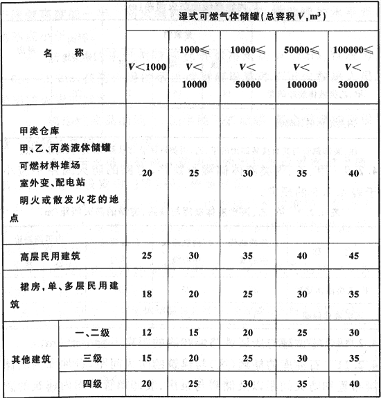 表4.3.1 濕式可燃?xì)怏w儲罐與建筑物、儲罐、堆場等的防火間距(m)