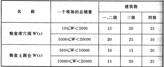 不同性質(zhì)物品堆場(chǎng)之間的防火間距,不應(yīng)小于本表相應(yīng)儲(chǔ)量堆場(chǎng)與四級(jí)耐火等級(jí)建筑物防火間距的較大值。