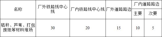 表4.5.3 露天、半露天可燃材料堆場(chǎng)與鐵路、道路的防火間距(m)