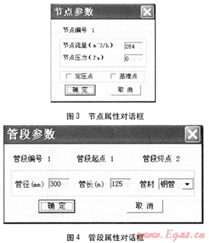 定義以管道為中心線且平行于管道的小面積矩形為線捕捉區(qū)域,以節(jié)點為圓心的小面積圓形為點捕捉區(qū)域,鼠標(biāo)在上述區(qū)域內(nèi)雙擊會分別彈出節(jié)點屬性和管段屬性對話框帕J,見圖3、4,為相應(yīng)的節(jié)點輸入流量或壓力,為相應(yīng)的管段輸入管長、管徑、管材。對于多氣源管網(wǎng)還需輸入氣源屬性,程序通過節(jié)點編號重排使得壓力基準(zhǔn)點編號最大,定壓點隨基準(zhǔn)點居后編排,便于節(jié)點方程組的求解。點捕捉和線捕捉技術(shù)實現(xiàn)了管網(wǎng)圖和數(shù)據(jù)的緊密結(jié)合,更加直觀、形象,輸入大量管段和節(jié)點參數(shù)時,很大程度上減少了輸入的差錯,提高了效率。