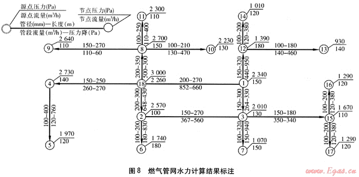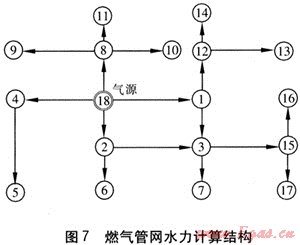 圖7為燃?xì)夤芫W(wǎng)水力計算結(jié)構(gòu),進(jìn)行水力計算后在Auto CAD中自動輸出的水力計算結(jié)果標(biāo)注圖見圖8。