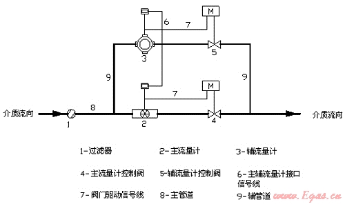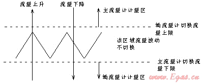 組合式流量計的測量原理是:當(dāng)通過流量計的流量為零時,主流量控制閥接受主流量計的信號關(guān)閉,輔流量控制閥開啟,此時輔流量計處于等待流量通過的狀態(tài);當(dāng)輔流量計有流量通過,并且流量低于輔流量計設(shè)置的切換流量上限值時,流量經(jīng)輔管線流動,由輔流量計進(jìn)行計量。當(dāng)工作流量上升到高于輔流量計設(shè)置的切換流量上限值時,則輔流量計發(fā)送電信號至主流量計,然后由主流量計控制閥接受主流量計信號而打開,待主流量計進(jìn)入計量狀態(tài)后,副流量計控制閥關(guān)閉。當(dāng)流量下降到主流量計設(shè)置的切換流量下限值時,主流量計發(fā)出電信號到輔流量計,輔流量控制閥接受輔流量計的信號而打開,由輔流量計進(jìn)行計量,主流量計控制閥接受主流量計的信號而關(guān)閉。由于主流量計的下限切換流量與輔流量計的上限切換流量之間存在有一定的閾值,可避免主輔流量計之間頻繁的切換。組合式流量計能根據(jù)工作流量的大小,自動選擇測量范圍不同的流量計進(jìn)行計量,達(dá)到了擴(kuò)大計量范圍的目的,同時也解決了小流量通過時流量計不計量或計量不準(zhǔn)確的問題。