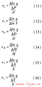 根據(jù)式(9)對居民生活用氣量指標(biāo)進(jìn)行彈性分析。彈性分析的目的在于得到居民生活用氣量指標(biāo)對其影響因素的微小變化所做出的反應(yīng)。居民生活用氣量指標(biāo)相對各項影響因素的彈性如下: