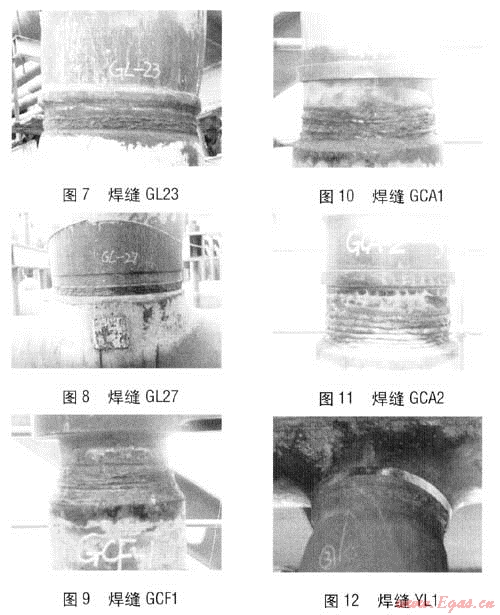 該鍋爐的設(shè)計(jì)結(jié)構(gòu)存在以下特點(diǎn):部分母材管件為三通式,連接方式為焊接連接,焊縫靠近三通管件的根部,且兩焊接件之間因壁厚不同,在焊縫附近形成不同程度的凸臺(tái)。我們篩選出12道典型的焊縫,焊接管道相關(guān)參數(shù)見表1,焊縫外觀見圖1~12.其中焊縫GL1的凸臺(tái)較小。由于凸臺(tái)與焊縫距離較近,導(dǎo)致無損探傷(射線、超聲波探傷)不能正常進(jìn)行。對(duì)于在安裝現(xiàn)場(chǎng)發(fā)現(xiàn)的問題,由于新建電廠鍋爐多,設(shè)備外形較大、生產(chǎn)期長(zhǎng),鍋爐制造單位往往難以在限定的期限內(nèi)對(duì)設(shè)備進(jìn)行設(shè)計(jì)修改和現(xiàn)場(chǎng)改造。