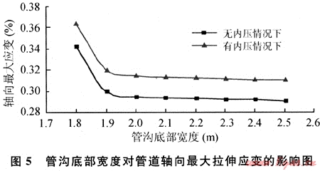 依據(jù)GB 50251—2003《輸氣管道工程設(shè)計(jì)規(guī)范》[8],深度在5m以內(nèi)時(shí),溝底寬度應(yīng)按下式確定:B=D+K,其中B為溝底寬度,m;D為管子外徑,m,該算例取1.219m;K為溝底加寬裕量,m,一般不少于0.5m。所以該算例中管溝底部寬度B≥1.719m(1.219m+0.5m),因此管溝底部寬度的最小值取1.8m。改變管溝底部寬度,計(jì)算得到的管道軸向最大拉伸應(yīng)變值如圖5所示。結(jié)果表明:隨著管溝底部寬度的增大,管道所受的軸向最大拉伸應(yīng)變減小,而且在從1.8m增加到1.9m時(shí)發(fā)生突變。由此可見(jiàn)管溝底部寬度取1.9m時(shí)比較經(jīng)濟(jì),再寬挖的意義不大。