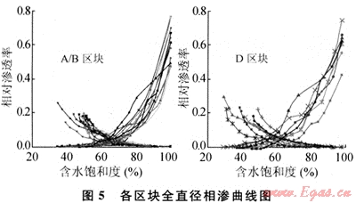 反映儲層為親水巖石,呈兩相流特征,束縛水飽和度高,兩相滲流范圍小,氣驅(qū)水效率低。A區(qū)塊可流動氣飽和度區(qū)間為0~65.62%;束縛水飽和度34.38%~51%,兩相滲流范圍比較大,為49%~65.62%。B區(qū)塊可流動氣飽和度區(qū)間為0~70.28%;束縛水飽和度29.72%~49.81%,兩相滲流范圍比較大,為55%~69.5%(圖5)。