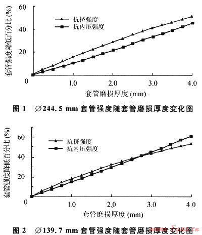 由圖1和圖2可以看出,在套管外徑相同的情況下,無論是抗擠強度和抗內(nèi)壓強度,隨著套管磨損厚度的增加套管強度均是降低的。在相同的磨損厚度情況下,磨損后套管的抗擠強度比抗內(nèi)壓強度降低得更快。如同樣是1mm的磨損量,抗擠強度降低了15%,而抗內(nèi)壓強度降低了10%。不同套管尺寸,強度降低的幅度也不相同,小直徑套管強度降低幅度比大尺寸套管更大。