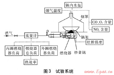 為研究負荷、鍋架相對高度(鍋架頂部距外圈燃燒器頂部的距離)、鍋架開口寬度對熱效率及煙氣的影響,筆者在采用節(jié)能環(huán)保型燃燒器基礎(chǔ)上,進行了一系列試驗研究。試驗用氣源為天然氣,壓力為2kPa。以三眼中餐炒菜灶作為試驗灶具,其單個燃燒器負荷為30kW,采用尖底炒菜鍋。試驗系統(tǒng)見圖3。