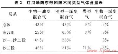 上式中V油、V煤分別代表混合氣中偏陸源油型氣和煤型氣的含量百分?jǐn)?shù)。通過公式可計(jì)算得出東部凹陷不同層段的天然氣的混合比例(表2)。