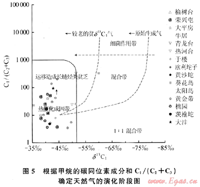 總體看,該區(qū)大部分天然氣含量有較大差異,說明該區(qū)存在明顯的運(yùn)移作用過程。 依據(jù)天然氣甲烷碳同位素值及干燥系數(shù)對(duì)天然氣的成熟度進(jìn)行估算,該區(qū)絕大多數(shù)樣品處于成熟階段,主要屬于熱解氣。但在黃沙坨及葵花島地區(qū),其天然氣的成熟度相對(duì)比較高,已經(jīng)達(dá)到了裂解氣的階段。因而可依據(jù)天然氣的甲烷同位素值對(duì)各個(gè)地區(qū)天然氣的演化階段進(jìn)行劃分,主要屬于熱解氣。