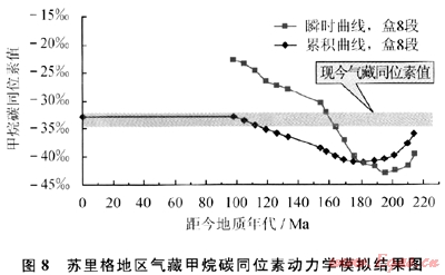 氣藏同位素動力學模擬實驗結(jié)果表明,累積甲烷碳同位素值曲線與現(xiàn)今氣藏同位素值范圍基本一致,同樣說明蘇里格地區(qū)天然氣藏主要為近源捕獲,并且是長期累積聚氣所形成的(圖8)。