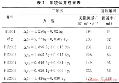 應(yīng)用壓力恢復(fù)、壓降、系統(tǒng)試井和一點(diǎn)法等多種試井方法研究儲層物性及產(chǎn)能特點(diǎn)。確定了各氣井較為真實(shí)可靠的產(chǎn)能方程(表2),為新井配產(chǎn)提供了依據(jù);同時,運(yùn)用三維建模和數(shù)值模擬技術(shù),確定了合理井距為1400m,為實(shí)現(xiàn)稀井高產(chǎn)創(chuàng)造了條件。