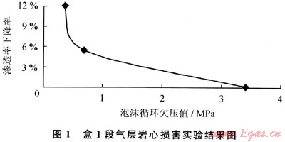 圖1給出了盒1段氣層巖心損害實(shí)驗(yàn)結(jié)果,從圖1中可以確定出盒1段氣層欠平衡水平井的最佳欠壓值為3.4MPa,即在盒1段氣層實(shí)施欠平衡水平井的循環(huán)介質(zhì)當(dāng)量循環(huán)密度需小于0.76g/cm3,滿足該條件的循環(huán)介質(zhì)只有氮?dú)夂偷獨(dú)馀菽?,但考慮到鉆井時(shí)產(chǎn)生的振動(dòng)影響、電磁隨鉆測(cè)量系統(tǒng)的可靠性要求以及鉆頭的冷卻問(wèn)題,決定選用可循環(huán)氮?dú)馀菽鳛檠h(huán)介質(zhì),其當(dāng)量循環(huán)密度為0.2~0.5g/cm3,滿足了施工要求。