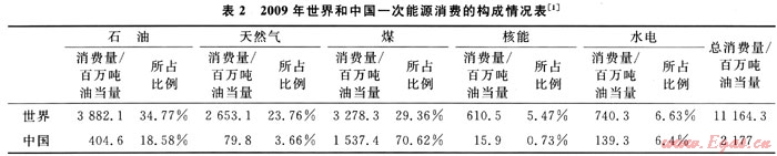世界一次能源消費量除2009年的金融危機造成下降外,其他各年均逐漸上升,10年總計上升了12.4%。中國的一次能源消費量,一直處于上升狀態(tài),金融危機也沒有影響其上升的勢頭(表1),10年總計上升了133%。中國的一次能源消費量從1999年占世界的10.3%提高到2009年的19.5%,共提高了9.2個百分點,成為全球一次能源消費量增長最快的國家。中國正處于工業(yè)化和城市化發(fā)展階段,未來一次能源消費量仍將快速增長,對中國能源供給能力產生了巨大的壓力,化石能源消費量在相當長的時間內仍將增長。