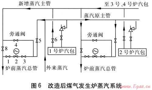 針對以上問題,我們對蒸汽系統(tǒng)進(jìn)行了改進(jìn):①重新布置1根長度為40m、外徑為108mm的無縫鋼管作為自產(chǎn)蒸汽的主管道(即新增自產(chǎn)蒸汽主管)。②將4臺煤氣發(fā)生爐汽包的出汽管與原主管分開后,接到新增自產(chǎn)蒸汽主管上。③在新增自產(chǎn)蒸汽主管至每臺煤氣發(fā)生爐飽和管之間加1個DN 100mm的截止閥(8號閥)。④將原來旁通閥(4號閥)由截止閥改為閘閥。改造后煤氣發(fā)生爐蒸汽系統(tǒng)見圖6。